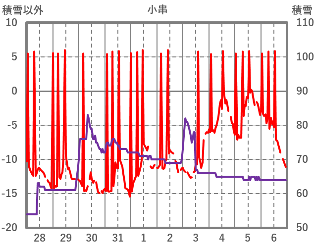 | 日 | 時 | 気温 | 降水 | 風向/風速 | 日照 | 積雪 | 降雪 |