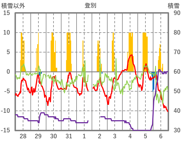 | 日 | 時 | 気温 | 降水 | 風向/風速 | 日照 | 積雪 | 降雪 |
