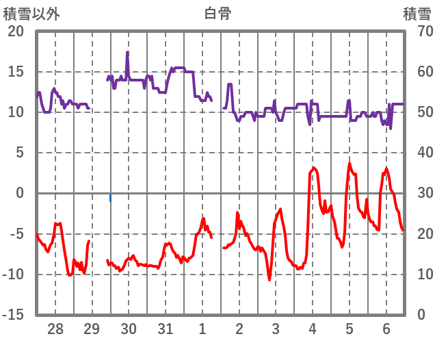 | 日 | 時 | 気温 | 降水 | 風向/風速 | 日照 | 積雪 | 降雪 |