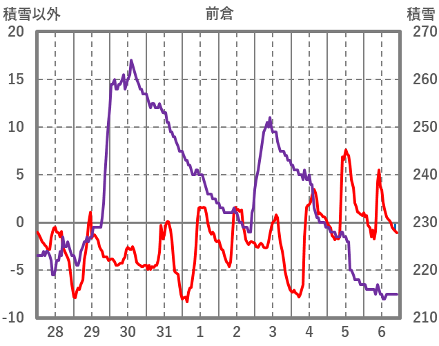 | 日 | 時 | 気温 | 降水 | 風向/風速 | 日照 | 積雪 | 降雪 |