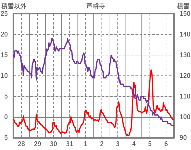 | 日 | 時 | 気温 | 降水 | 風向/風速 | 日照 | 積雪 | 降雪 |