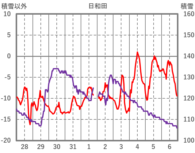 | 日 | 時 | 気温 | 降水 | 風向/風速 | 日照 | 積雪 | 降雪 |