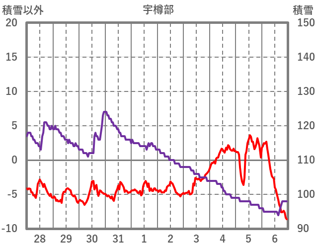 | 日 | 時 | 気温 | 降水 | 風向/風速 | 日照 | 積雪 | 降雪 |