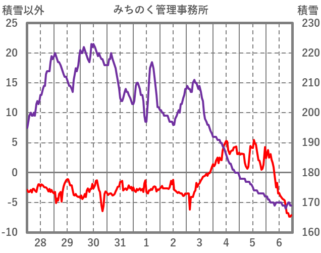 | 日 | 時 | 気温 | 降水 | 風向/風速 | 日照 | 積雪 | 降雪 |