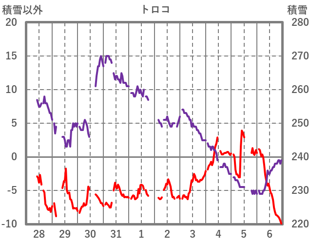| 日 | 時 | 気温 | 降水 | 風向/風速 | 日照 | 積雪 | 降雪 |