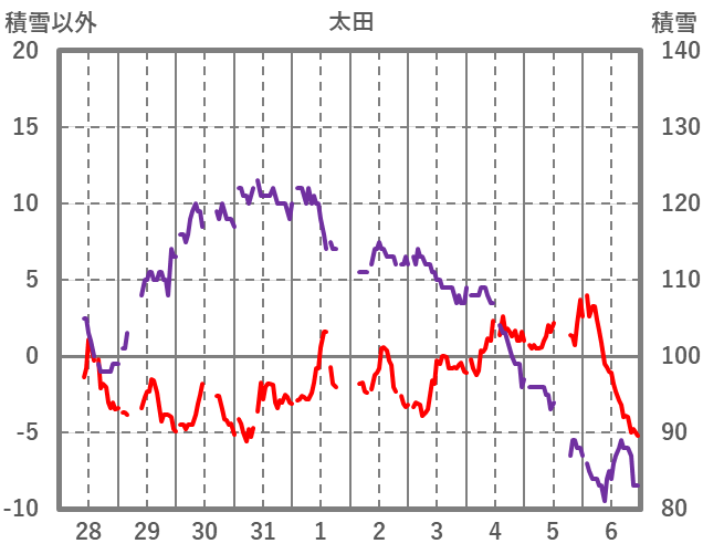 | 日 | 時 | 気温 | 降水 | 風向/風速 | 日照 | 積雪 | 降雪 |