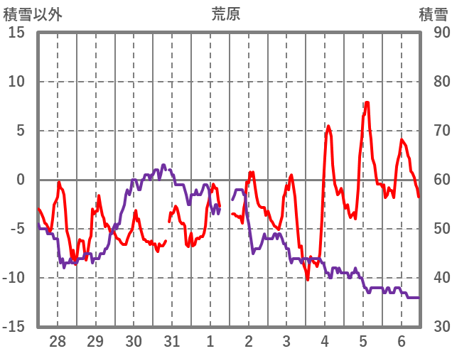 | 日 | 時 | 気温 | 降水 | 風向/風速 | 日照 | 積雪 | 降雪 |