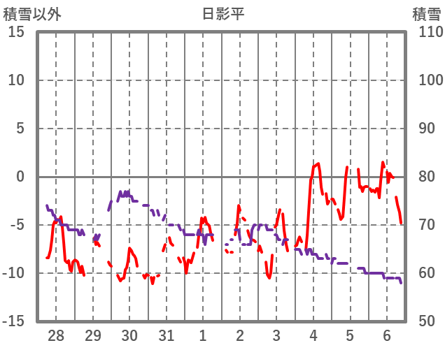 | 日 | 時 | 気温 | 降水 | 風向/風速 | 日照 | 積雪 | 降雪 |