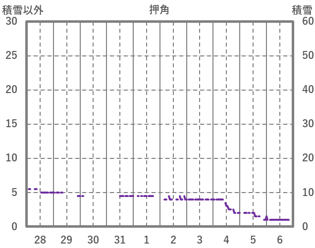 | 日 | 時 | 気温 | 降水 | 風向/風速 | 日照 | 積雪 | 降雪 |