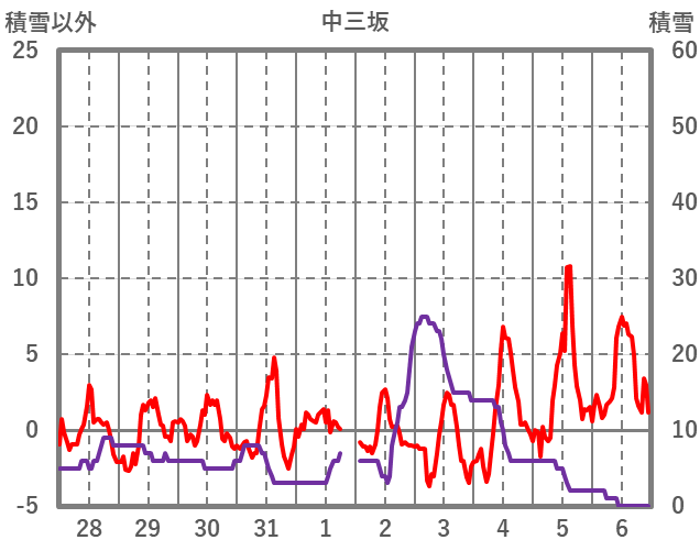 | 日 | 時 | 気温 | 降水 | 風向/風速 | 日照 | 積雪 | 降雪 |