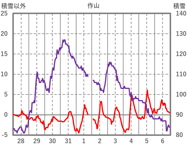 | 日 | 時 | 気温 | 降水 | 風向/風速 | 日照 | 積雪 | 降雪 |