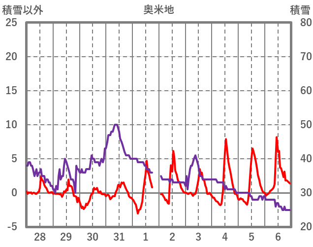 | 日 | 時 | 気温 | 降水 | 風向/風速 | 日照 | 積雪 | 降雪 |