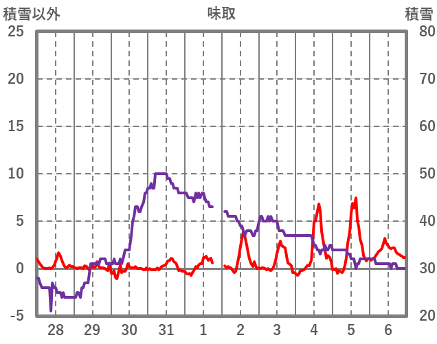 | 日 | 時 | 気温 | 降水 | 風向/風速 | 日照 | 積雪 | 降雪 |