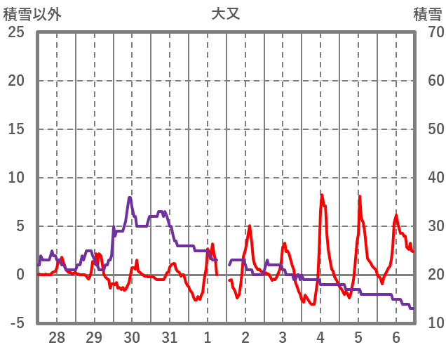 | 日 | 時 | 気温 | 降水 | 風向/風速 | 日照 | 積雪 | 降雪 |