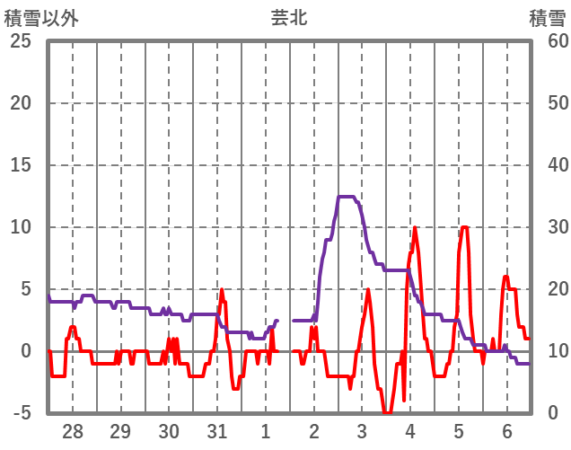 | 日 | 時 | 気温 | 降水 | 風向/風速 | 日照 | 積雪 | 降雪 |