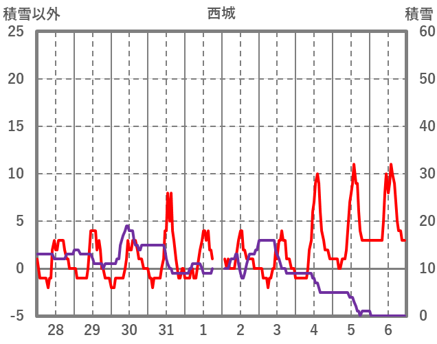 | 日 | 時 | 気温 | 降水 | 風向/風速 | 日照 | 積雪 | 降雪 |