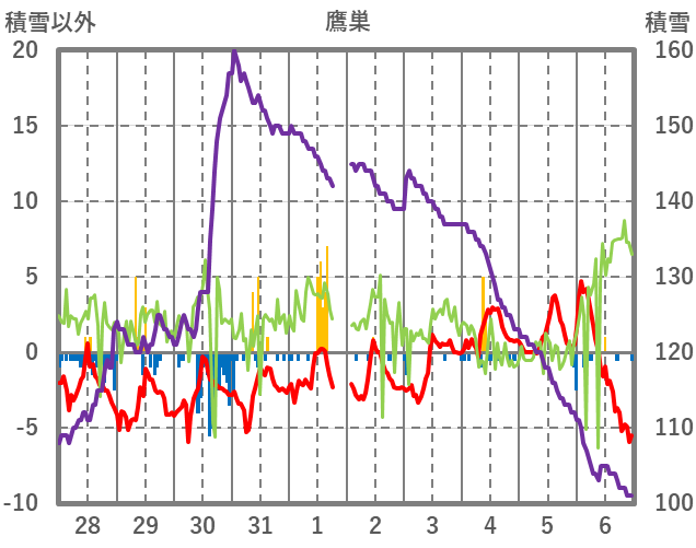 | 日 | 時 | 気温 | 降水 | 風向/風速 | 日照 | 積雪 | 降雪 |