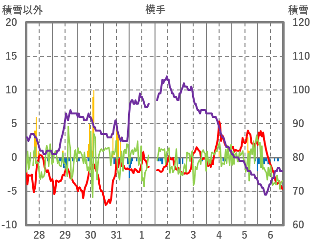 | 日 | 時 | 気温 | 降水 | 風向/風速 | 日照 | 積雪 | 降雪 |