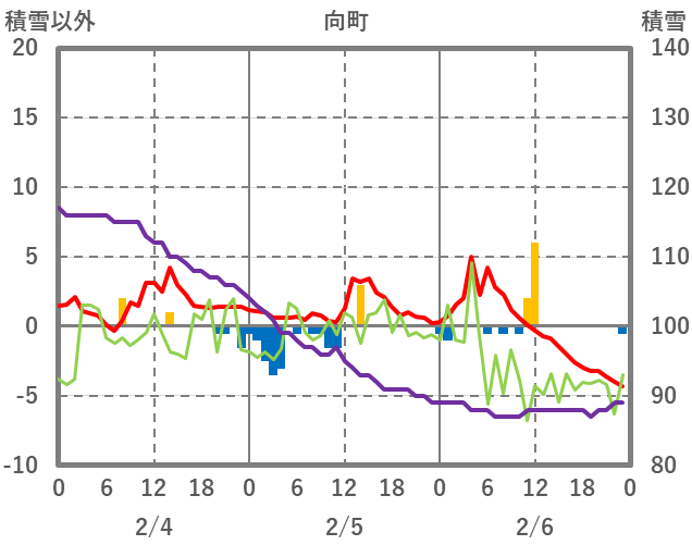 | 日 | 時 | 気温 | 降水 | 風向/風速 | 日照 | 積雪 | 降雪 |