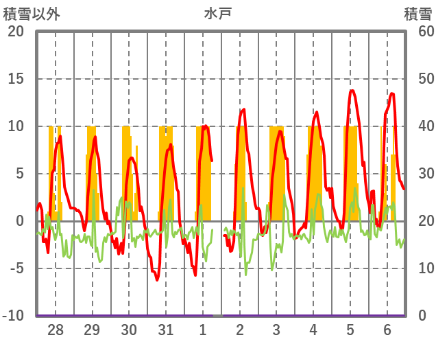 | 日 | 時 | 気温 | 降水 | 風向/風速 | 日照 | 積雪 | 降雪 |