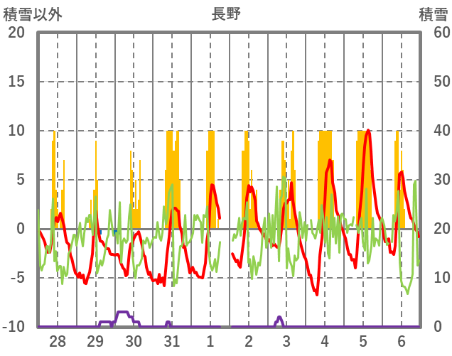 | 日 | 時 | 気温 | 降水 | 風向/風速 | 日照 | 積雪 | 降雪 |