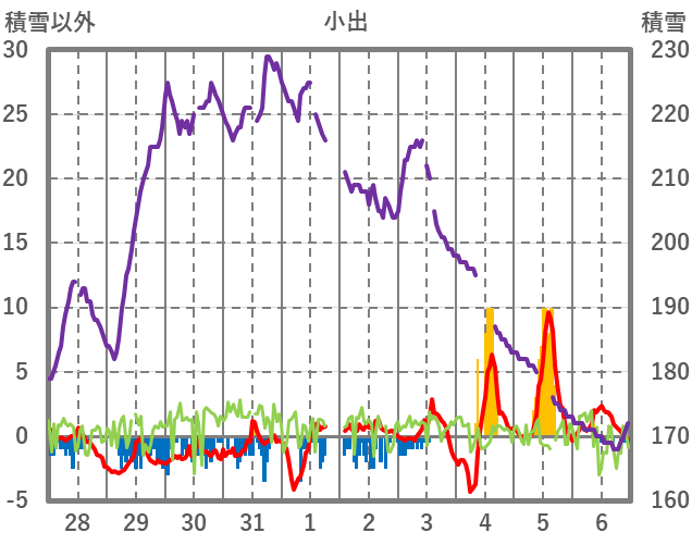 | 日 | 時 | 気温 | 降水 | 風向/風速 | 日照 | 積雪 | 降雪 |