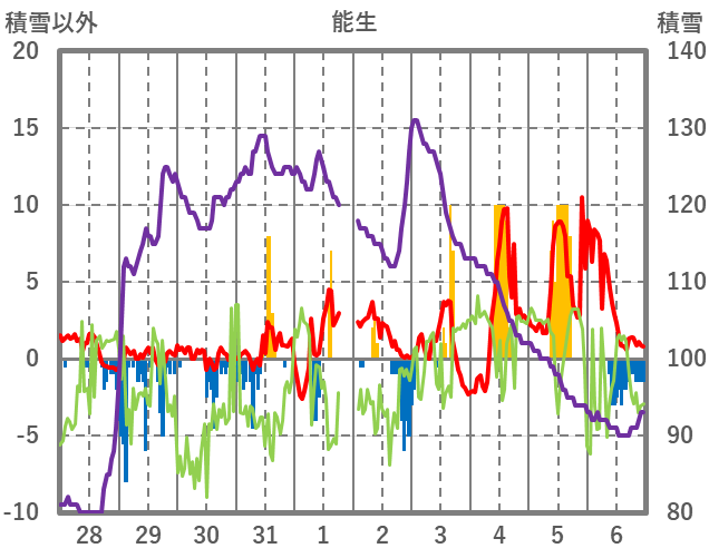 | 日 | 時 | 気温 | 降水 | 風向/風速 | 日照 | 積雪 | 降雪 |