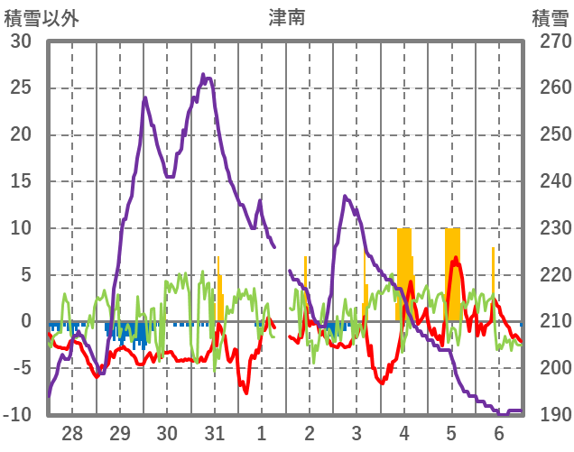 | 日 | 時 | 気温 | 降水 | 風向/風速 | 日照 | 積雪 | 降雪 |