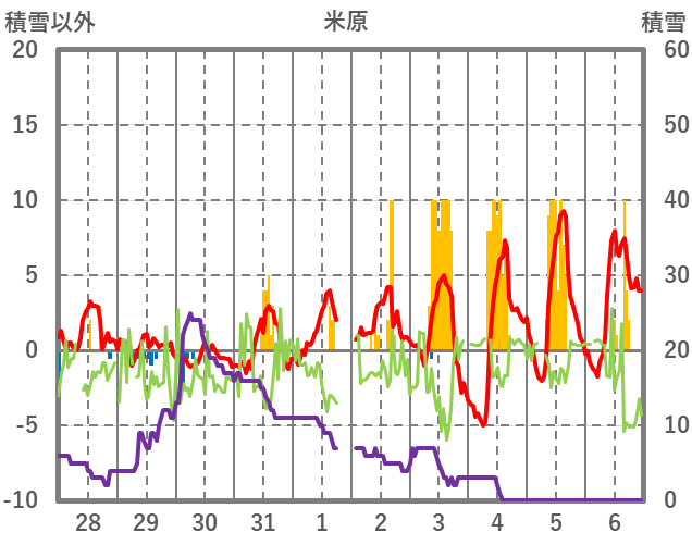 | 日 | 時 | 気温 | 降水 | 風向/風速 | 日照 | 積雪 | 降雪 |