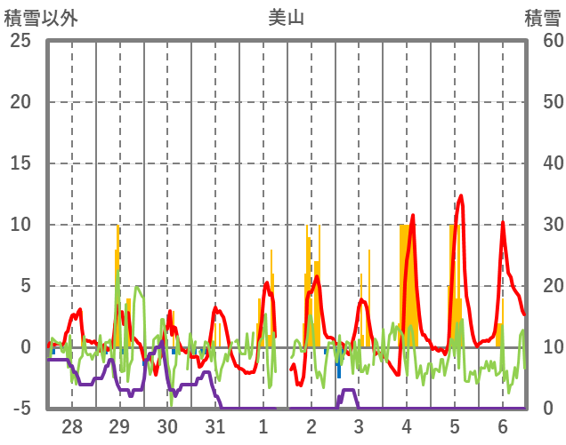 | 日 | 時 | 気温 | 降水 | 風向/風速 | 日照 | 積雪 | 降雪 |