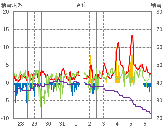 | 日 | 時 | 気温 | 降水 | 風向/風速 | 日照 | 積雪 | 降雪 |