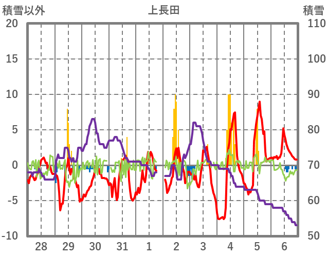 | 日 | 時 | 気温 | 降水 | 風向/風速 | 日照 | 積雪 | 降雪 |