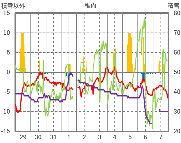 | 日 | 時 | 気温 | 降水 | 風向/風速 | 日照 | 積雪 | 降雪 |