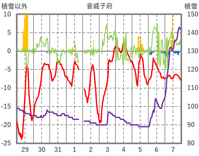 | 日 | 時 | 気温 | 降水 | 風向/風速 | 日照 | 積雪 | 降雪 |