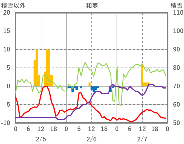 | 日 | 時 | 気温 | 降水 | 風向/風速 | 日照 | 積雪 | 降雪 |