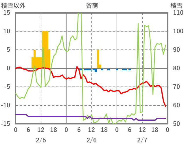 | 日 | 時 | 気温 | 降水 | 風向/風速 | 日照 | 積雪 | 降雪 |