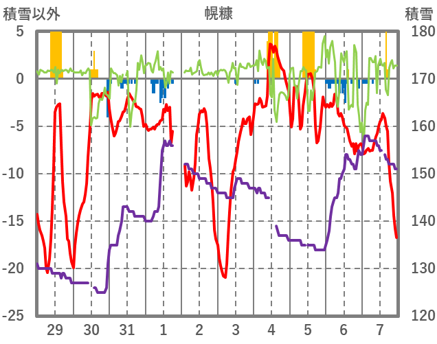| 日 | 時 | 気温 | 降水 | 風向/風速 | 日照 | 積雪 | 降雪 |