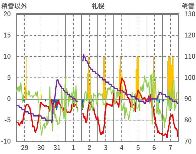 | 日 | 時 | 気温 | 降水 | 風向/風速 | 日照 | 積雪 | 降雪 |
