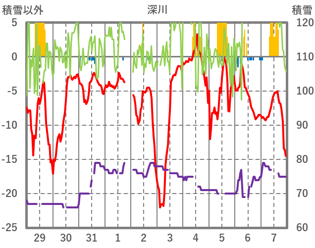 | 日 | 時 | 気温 | 降水 | 風向/風速 | 日照 | 積雪 | 降雪 |