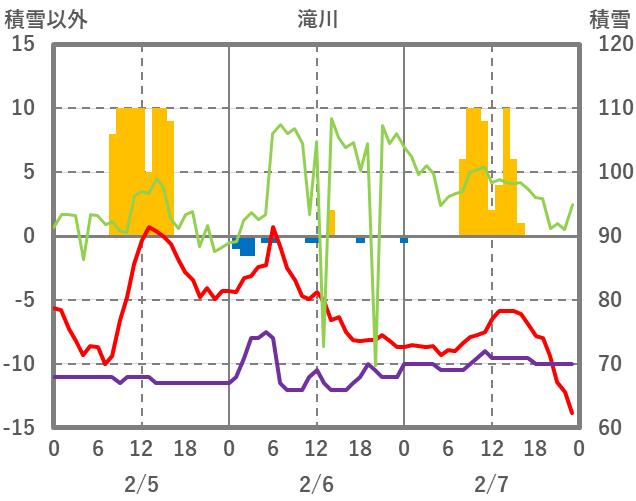 | 日 | 時 | 気温 | 降水 | 風向/風速 | 日照 | 積雪 | 降雪 |