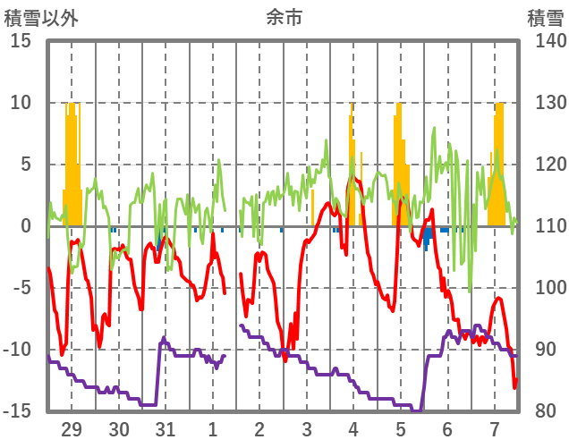 | 日 | 時 | 気温 | 降水 | 風向/風速 | 日照 | 積雪 | 降雪 |