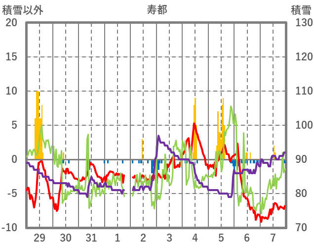 | 日 | 時 | 気温 | 降水 | 風向/風速 | 日照 | 積雪 | 降雪 |