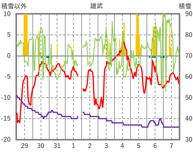 | 日 | 時 | 気温 | 降水 | 風向/風速 | 日照 | 積雪 | 降雪 |