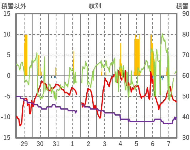 | 日 | 時 | 気温 | 降水 | 風向/風速 | 日照 | 積雪 | 降雪 |