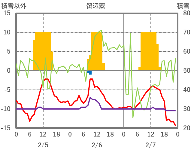 | 日 | 時 | 気温 | 降水 | 風向/風速 | 日照 | 積雪 | 降雪 |
