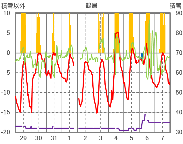 | 日 | 時 | 気温 | 降水 | 風向/風速 | 日照 | 積雪 | 降雪 |
