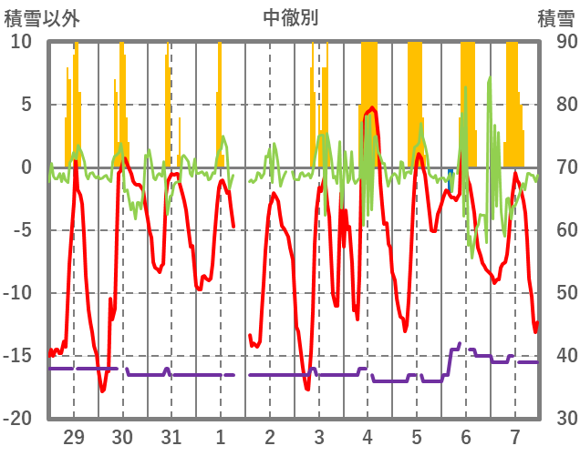 | 日 | 時 | 気温 | 降水 | 風向/風速 | 日照 | 積雪 | 降雪 |