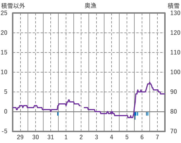 | 日 | 時 | 気温 | 降水 | 風向/風速 | 日照 | 積雪 | 降雪 |
