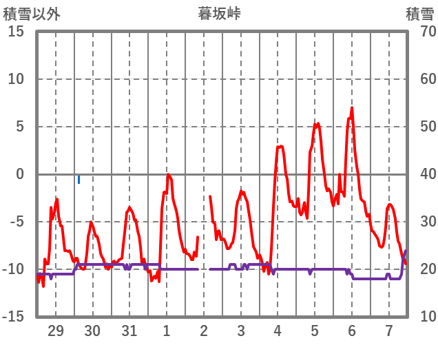 | 日 | 時 | 気温 | 降水 | 風向/風速 | 日照 | 積雪 | 降雪 |