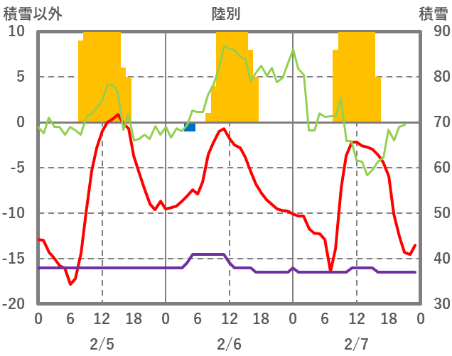 | 日 | 時 | 気温 | 降水 | 風向/風速 | 日照 | 積雪 | 降雪 |